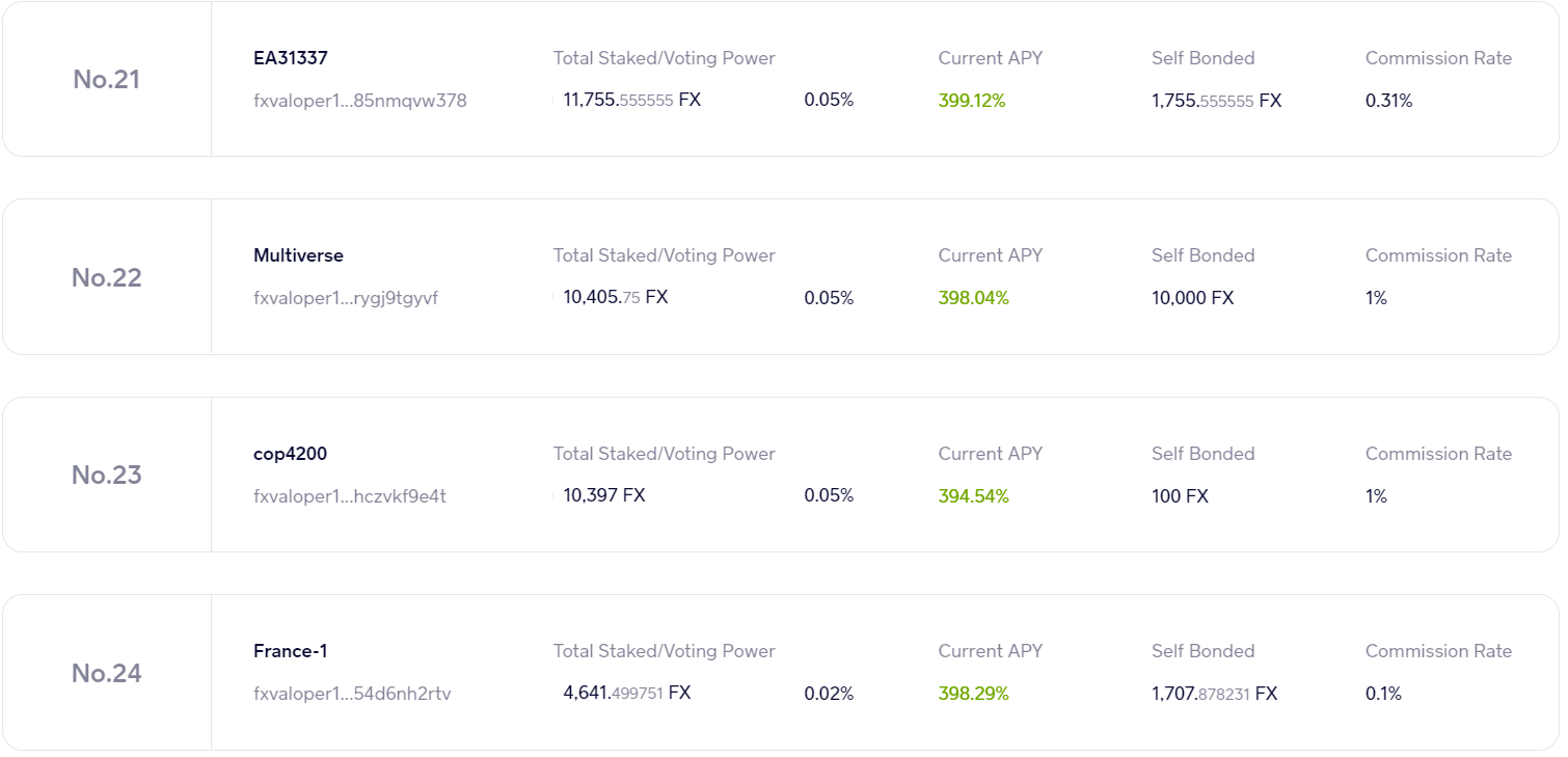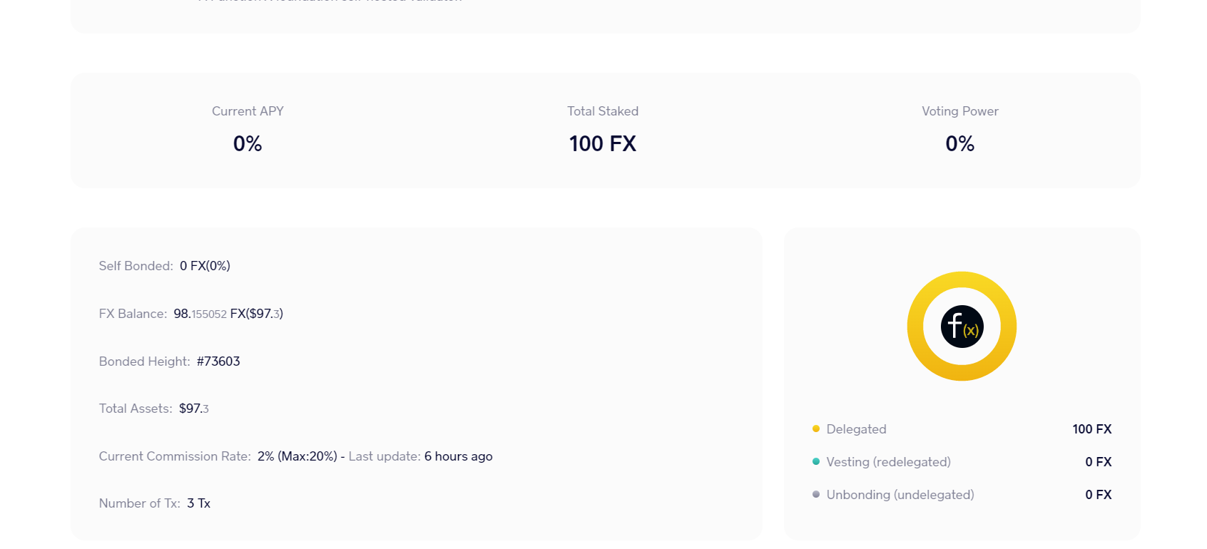 to the rest of the aspiring validators, ive delegated some FX to you so the explorer will show a >0% voting power (which showed 0% initially because of limited decimal places).