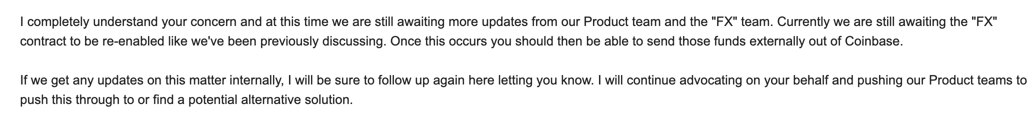 As of this morning…when are you going to tell coinbase you never planned or plan to re-enable the FX contract. Why not just tell them?